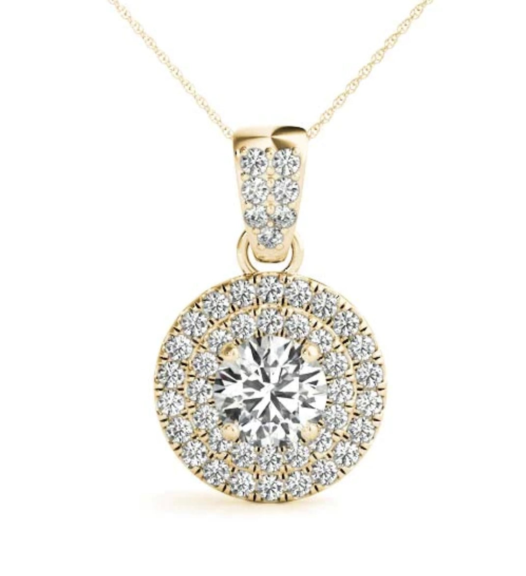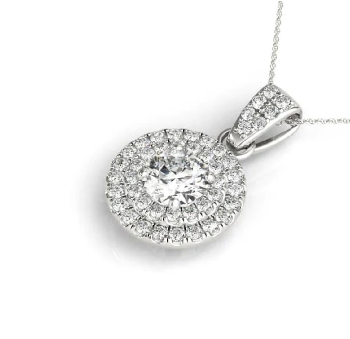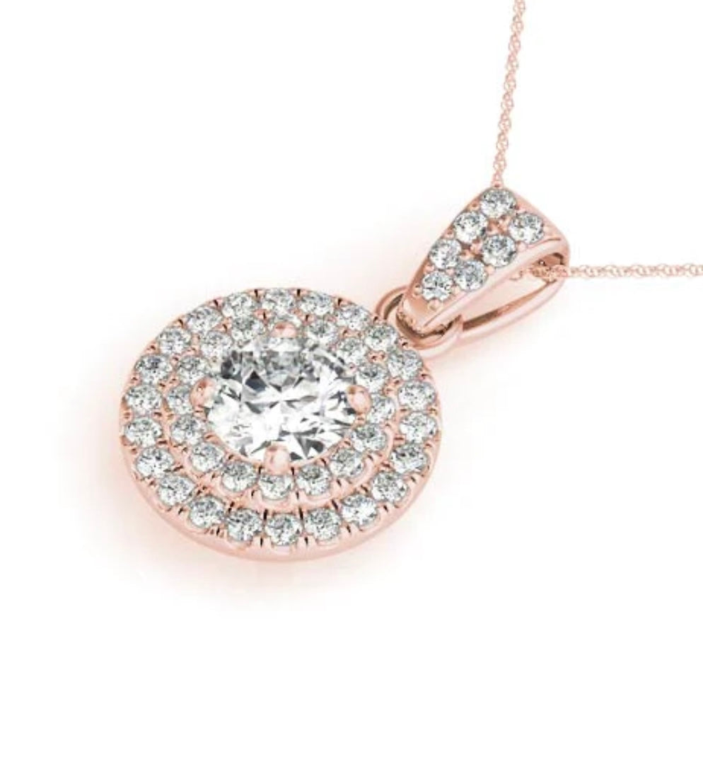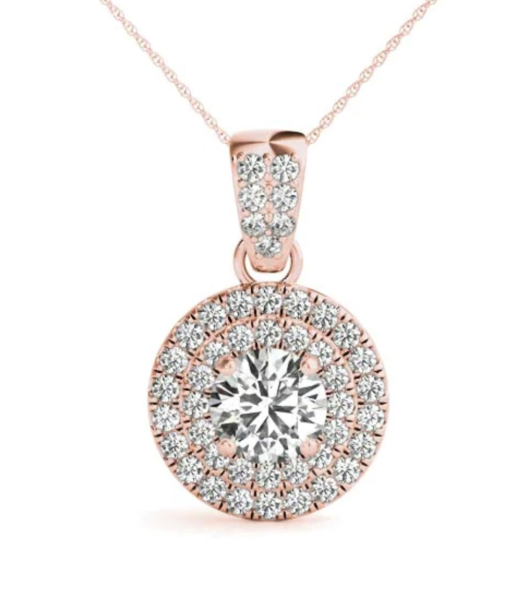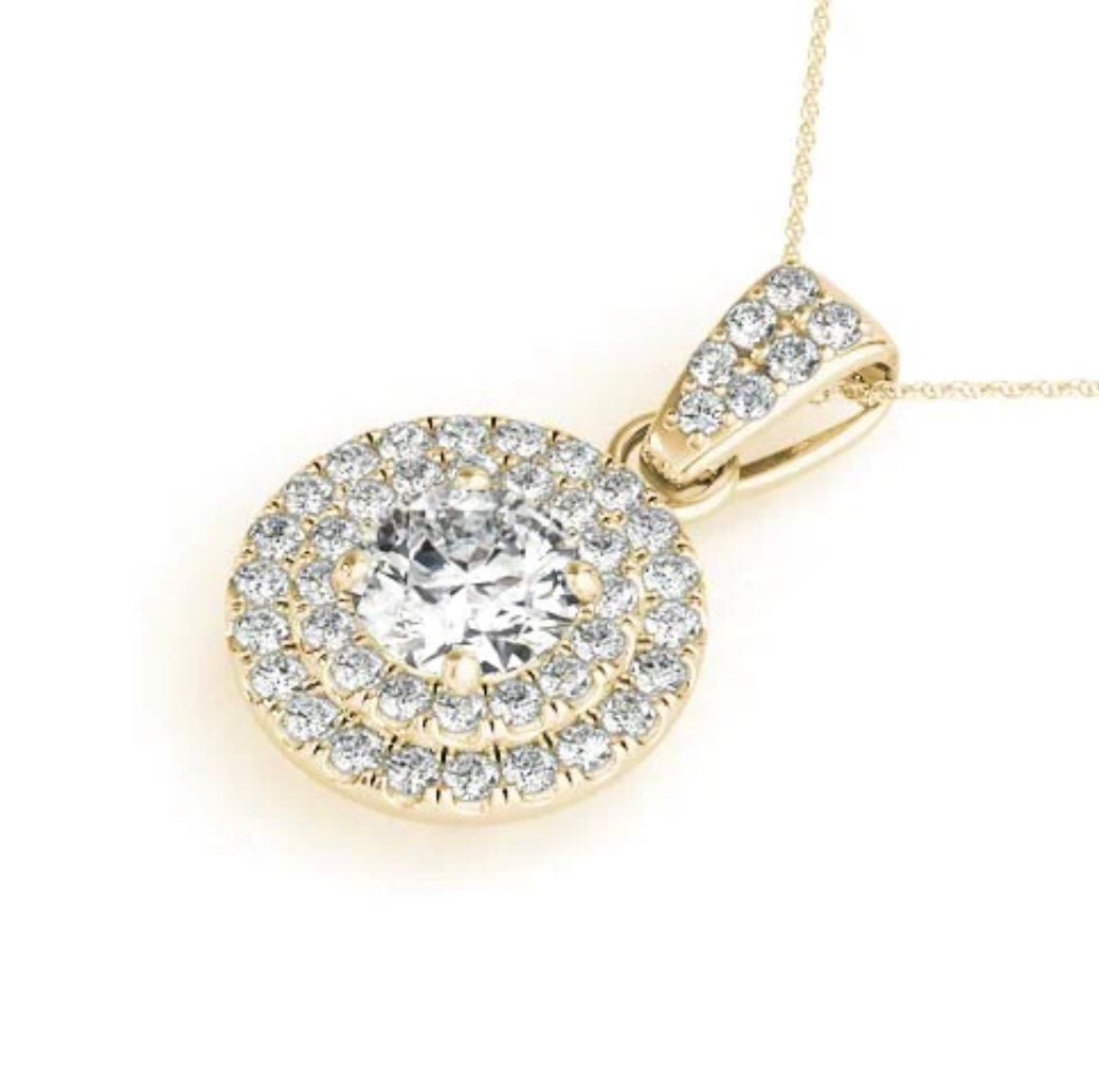 With a stunning double round halo and double diamond row bail, this pendant boasts a luxurious design that exudes elegance. Perfect for those looking to add a touch of opulence to their jewelry collection, this 18KT gold pendant is a must-have for any fashion-forward individual.