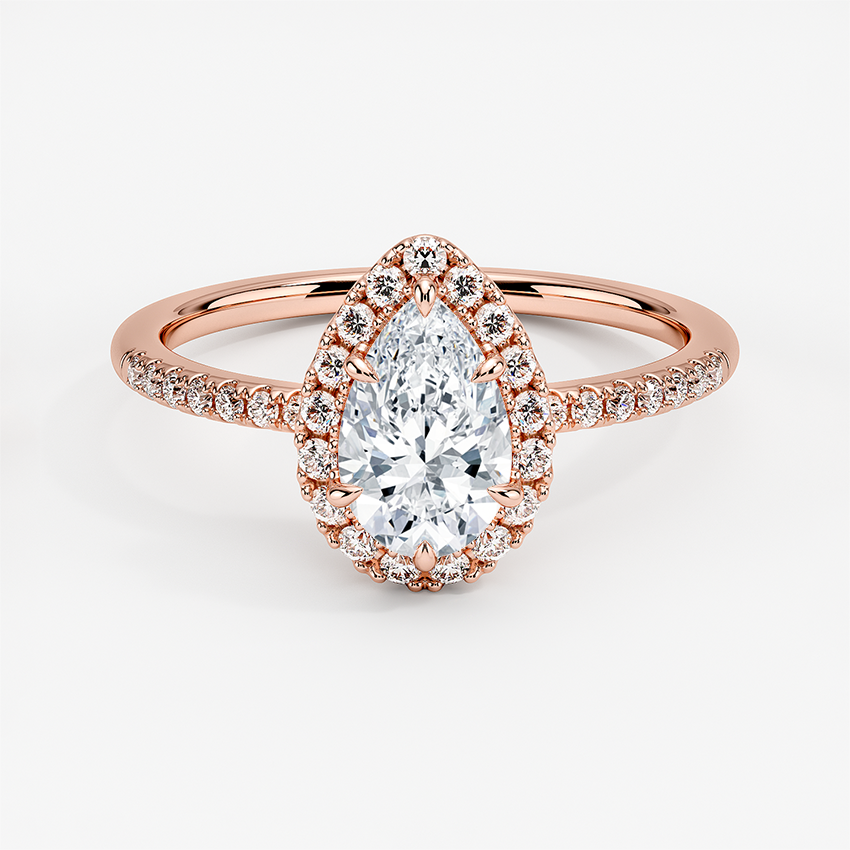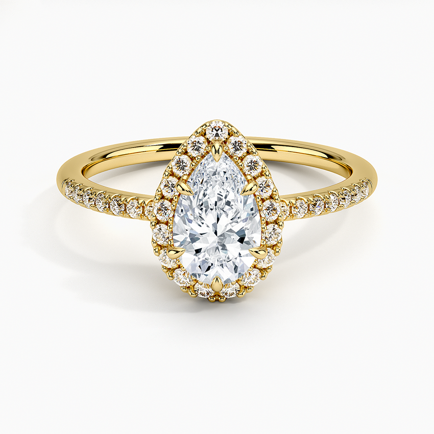 Our rare Pear Shape cut diamond set in a halo setting engagement ring, 18KT Gold is available in all sizes Discover the timeless elegance and rarity of our Pear Shape cut diamond engagement ring. Featuring a beautiful halo setting and made of 18KT Gold, this ring is available in every size for the perfect fit. Elevate your proposal to the next level with this stunning and one-of-a-kind piece.